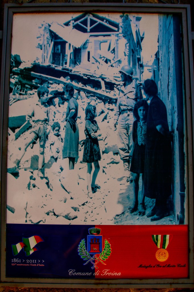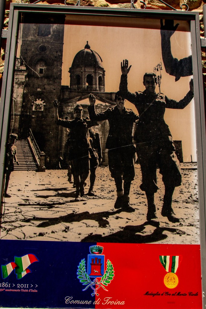 Doch dann sehe ich aus der Hitzeglocke verschwommen in einer endlosen Reihe Soldaten auftauchen, die unter der erbarmungslosen Sonne im Gänsemarsch hinauf nach Troina marschieren. Dann, schon deutlicher, erkenne ich, dass sie mitten im Nirgendwo auf einen Bauern treffen, der ihnen mit seinem Stock die Richtung weist, in die die Deutschen sich – endlich – davon gemacht haben. Auf einem Feldvorsprung halten die Soldaten Ausschau nach feindlicher Bewegung, ein Panzer trifft auf einen Mann mit Esel. Und dann erreiche ich nach einem endlos scheinenden Marsch mit den Soldaten Troina. Am Ortseingang kommt ihnen mit hoch erhobenen Händen ein Mann entgegen. „Tut mir nichts“, meine ich ihn flehen zu hören. In den engen Gassen des mittelalterlichen Zentrums treffen die Soldaten auf traumatisierte Einheimische, Alte jammern, Frauen kreischen, Kinder weinen. Ich sehe, wie die Amerikaner vor der Kulisse des Doms italienische Kriegsgefangene abführen, ich bin in einer Stadt in Trümmern.