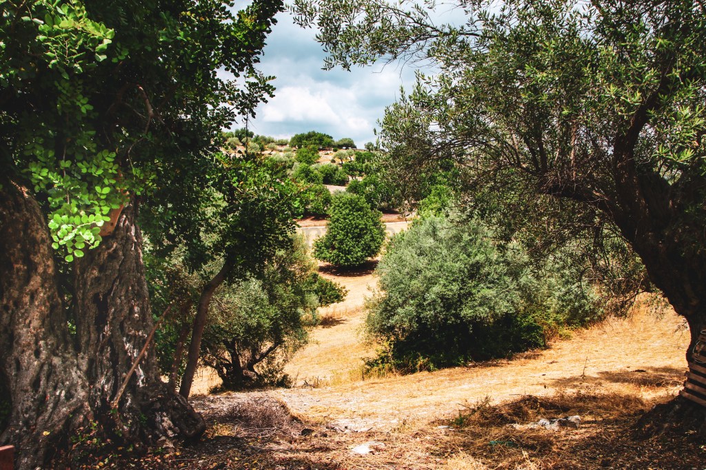 Die Landschaft ist hier in den Monti Iblei kleinteiliger als im Inselinneren. Die Felder sind mit Mauern unterteilt. Getreideanbau wechselt sich mit Zitrus- oder Olivenbäumen ab. Auch Viehwirtschaft gibt es. In der Hitze suchen die Kühe Schatten unter einem Baum. In den Geschäften hier kann man ihre Milch, die „Ragusana“ kaufen. Auf meiner Route öffnen sich sogar Wege, die zu einer kleinen Wanderung einladen. Allerdings nur zu einer klitzekleinen, denn wie gesagt, ich bin alleine unterwegs.