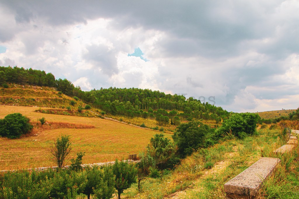 Ich biege diesmal also rechts ab, von der SS 115 in Richtung Giarratana. Berühmt für seine gigantischen Zwiebeln. Die werden auch hier in Noto vom Laster runter verkauft. Wie weit es dorthin ist, weiß ich nicht genau, ich könnte nachschauen, lass es aber bleiben. Schließlich ist ja bei solchen Mini-Roadtrips der Weg das Ziel. Die Provinzstraße führt zunächst immer geradeaus in einem Tal der wellenartigen Monti Iblei. Links und rechts Felder, Zitrusfrüchte, ein bisschen Getreide, nichts Besonderes.