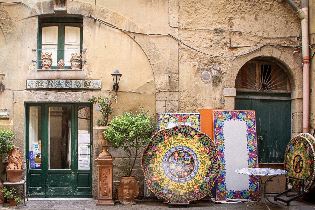 Und dann liegt vor mir Caltagirone, die Märchenwelt für Keramikliebhaber. Der moderne Name leitet sich vom arabischen Qal’at Ghiran ab und bedeutet in etwa „Schloss der Vasen“. Palazzi gibt es jedenfalls viele, auch viele kleine Häuschen, die sich an den Berg schmiegen. An allen ist etwas Keramisches zu finden und sei es nur die Hausnummer auf einer Fliese. Und in mindestens jedem zweiten größeren Gebäude, an den Hauptstraßen, in den Seitengassen oder in den Hinterhöfen der Palazzi, gibt es Keramikwerkstätten, die produzieren, was ihre Töpferscheiben hergeben.