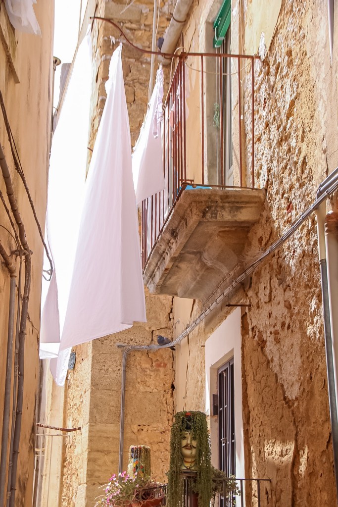 Da erzählt Carmela mir die Legende, die sich um die Keramikköpfe rankt wie die kunstvollen Ornamente: Um das Jahr 1100, während der Herrschaft der Mauren auf Sizilien, soll in Palermo, in der Kalsa, ein schönes Mädchen mit einer Haut wie Pfirsich und wunderschönen Augen, ihre Tage damit verbracht haben, sich um die Pflanzen auf dem Balkon zu kümmern. Eines Tages soll sie dabei ein junger dunkelhäutiger Mann beobachtet haben. Als er sie sah, verliebte er sich sofort in sie und beschloss, sie um jeden Preis zu bekommen. Das Mädchen erwiderte die stürmische Liebe des Mauren. Allerdings war das Glück nur von kurzer Dauer.