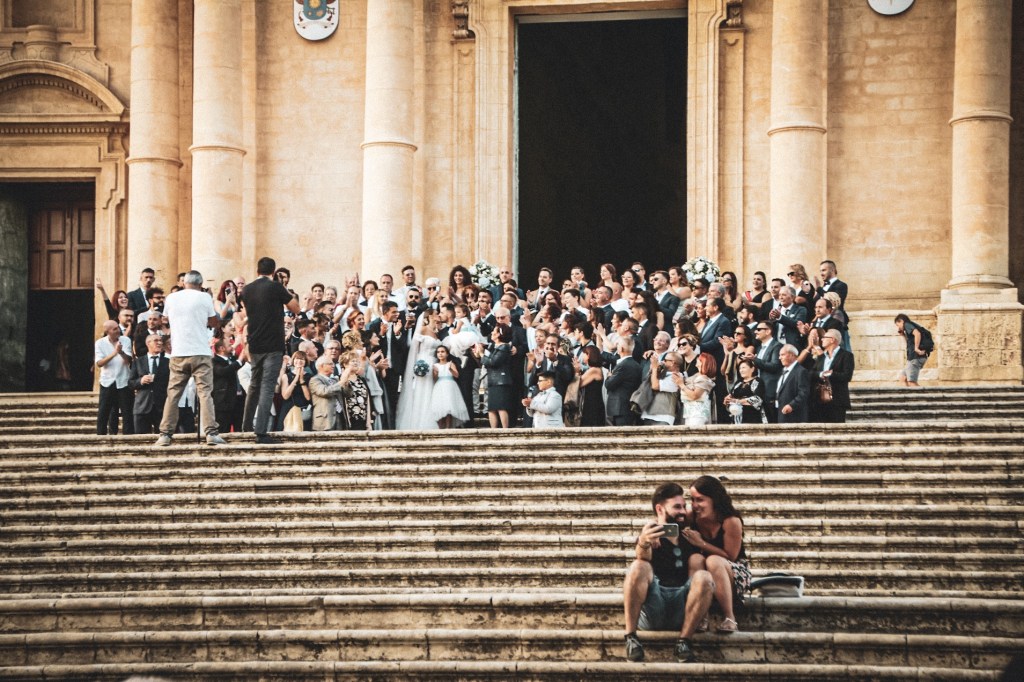 Ich habe mittlerweile dutzende Brautpaare diese Treppe vor der Kathedrale in Noto hinunter schreiten sehen. Ganz normale, wunderschöne, glückliche und verunsicherte. Riesige Familien, ganz riesige und einfach gigantisch große. Gewandet in Haute Couture oder Fast Fashion.