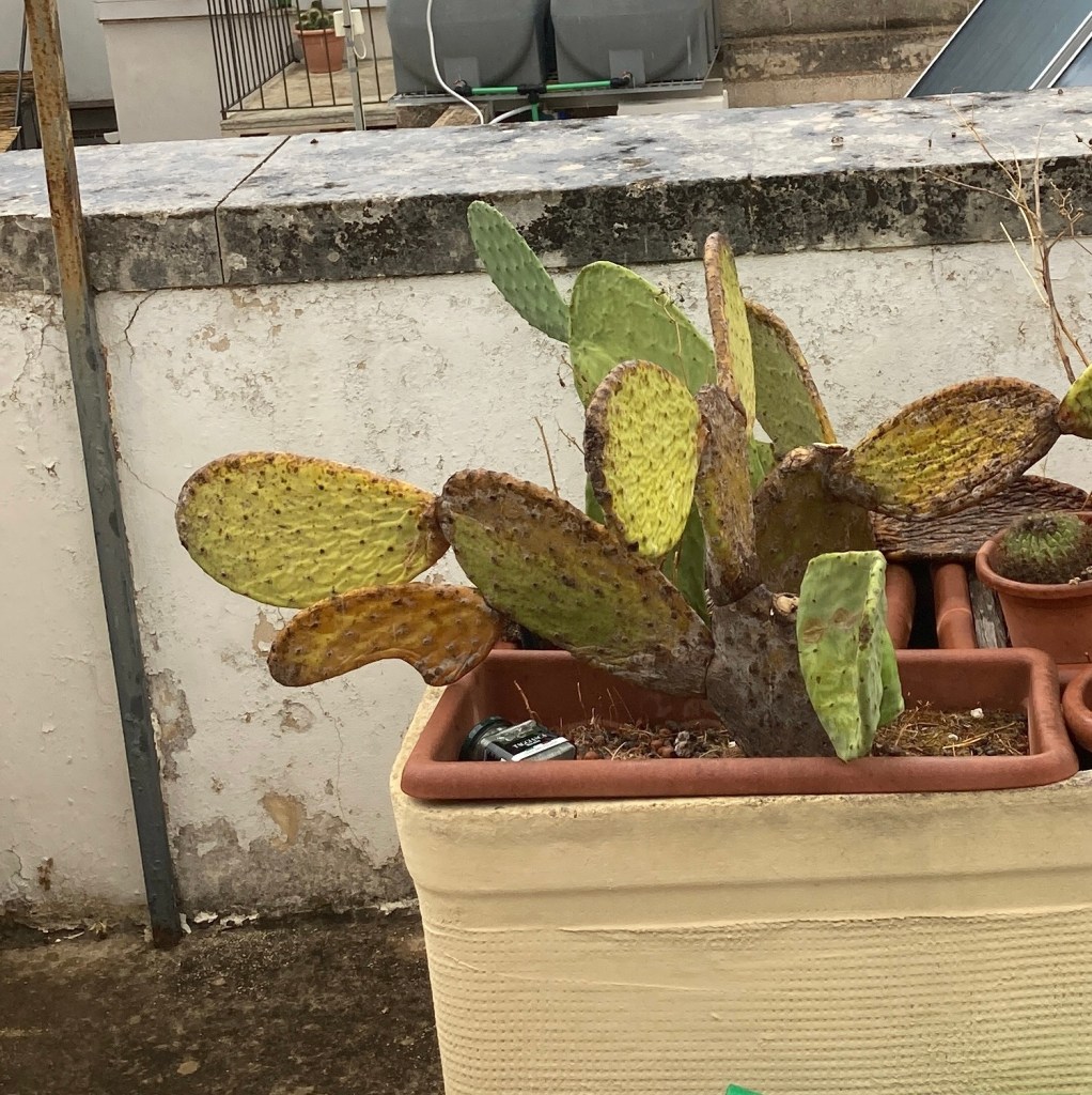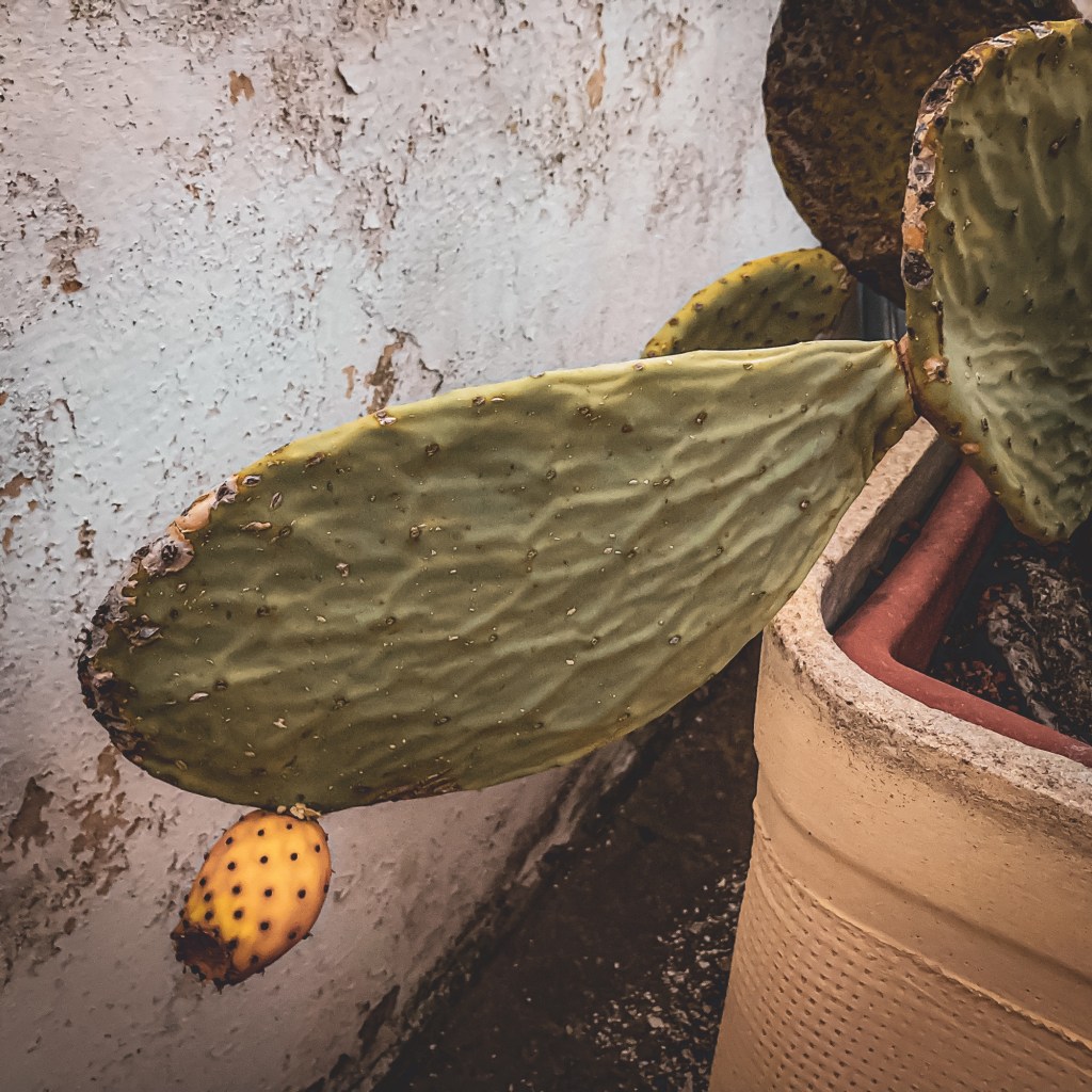 Solange muss ich mich mit einer alten Zisterne auf der Dachterrasse begnügen, in die ich vor Jahren die Ableger einer Kaktusfeige oder richtiger Opuntia ficus-indica gepflanzt habe. Die erweist sich als Überlebenskünstlerin. Der prallen Sonne ausgesetzt, windumtost, oft monatelang ohne Wasser, in ausgelaugter Erde darbend.