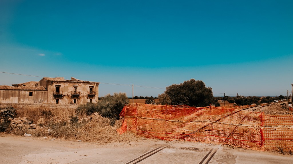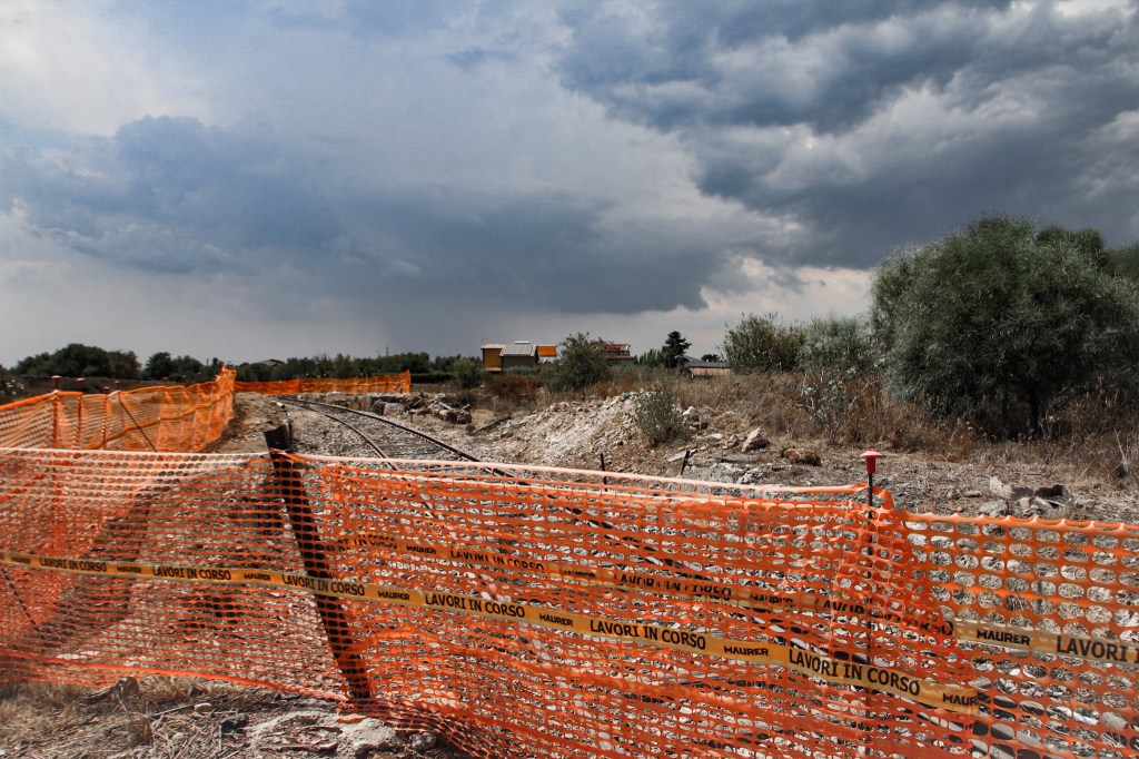 Hm, was sollte das jetzt bedeuten? Ich halte also an der nächsten Möglichkeit an, um mir die Sache aus der Nähe anzuschauen. Tatsächlich, Bauarbeiten an einer Bahnlinie. Kaum zu glauben. Fast ein bisschen fassungslos stehe ich an der im August verwaisten Baustelle, auf der der Wind den Staub aufwirbelt. War ja eigentlich hier nie Thema, denke ich. Habe in über zehn Jahren nie jemanden über den Wunsch sprechen hören, eine Bahnlinie zu reaktiveren. Manchmal hab ich mir zwar gedacht, wie toll das wäre, wenn ich Richtung Pachino an den verfallenen Bahnhöfen vorbeigefahren bin. Mit der Eisenbahn zu den schönen Stränden gelangen zu können, ins Vendicari und nicht jedes Mal in Catania ein Mietauto buchen zu müssen, um hier in meiner Provinz mobil zu sein.