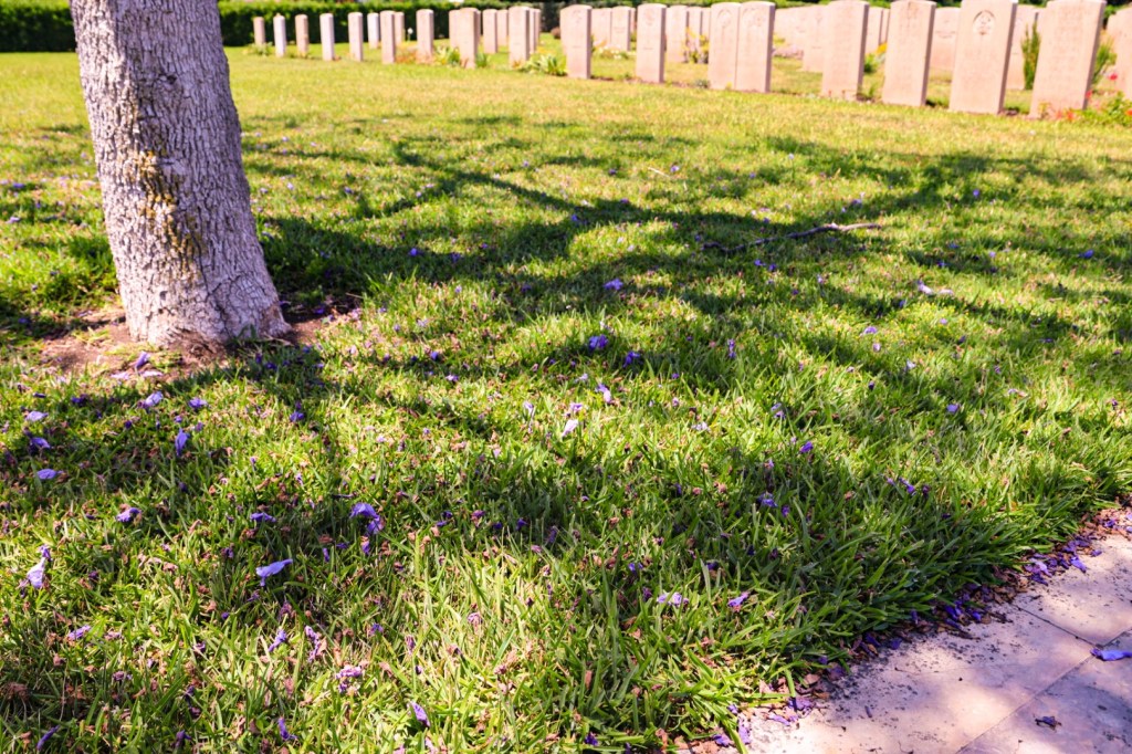 Die herabgefallenen zarten lila Blüten des Palisanderholzbaums sprenkeln den Rasen des Syracuse War Cemetery. 1059 Soldaten des Commonwealth liegen hier. Sie fielen vor 81 Jahren bei der Befreiung Siziliens.