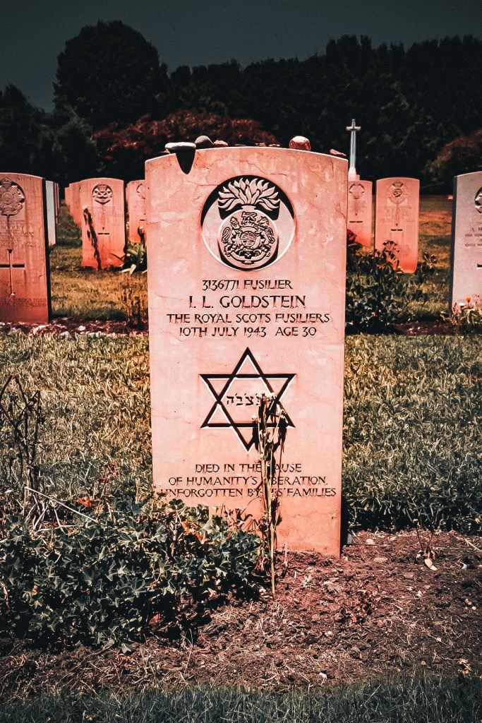 Ich gehe durch die Reihen. Lese die Namen, die Einheit, das Alter. Viele der Gefallenen waren erst Anfang 20, als sie bei der Landung der Alliierten auf Sizilien am 10. Juli 1943 und in den wochenlangen Kämpfen danach starben. Besonders berührt hat mich aber eine Inschrift auf einem der wenigen jüdischen Grabsteine: „Died in the cause of humanity’s liberation“.