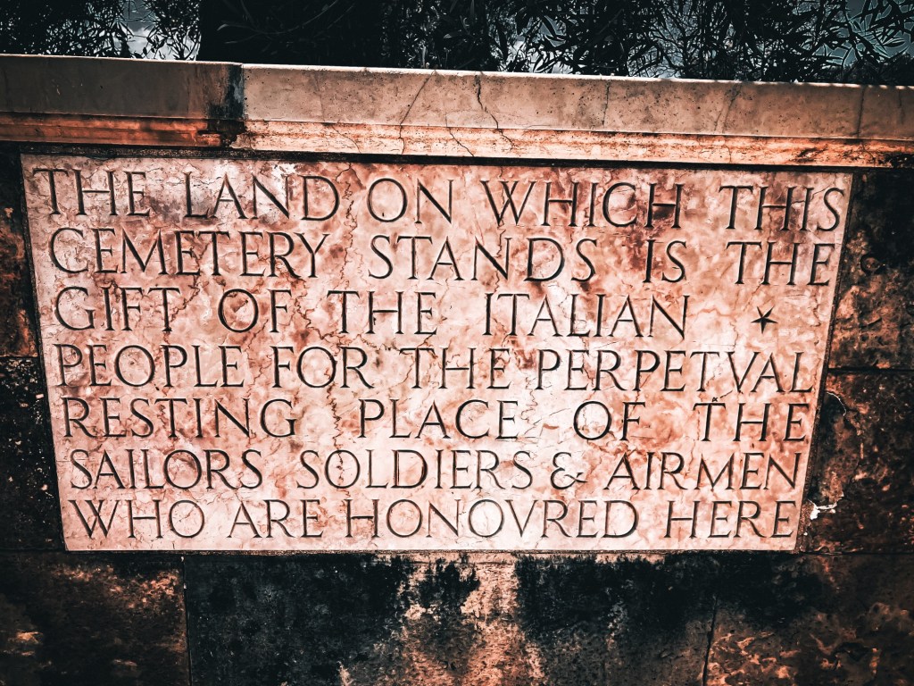Der 80. Jahrestag des D-Day, der Landung der Alliierten am 6. Juni 1944 in der Normandie, hat mich inspiriert, den Soldatenfriedhof zu besuchen, an dem ich schon so oft achtlos vorbeigefahren bin. Ich bin die Einzige auf der Anlage in fast unmittelbarer Nachbarschaft des cimitero, auf dem die Toten Siracusas ihre letzte Ruhe finden.