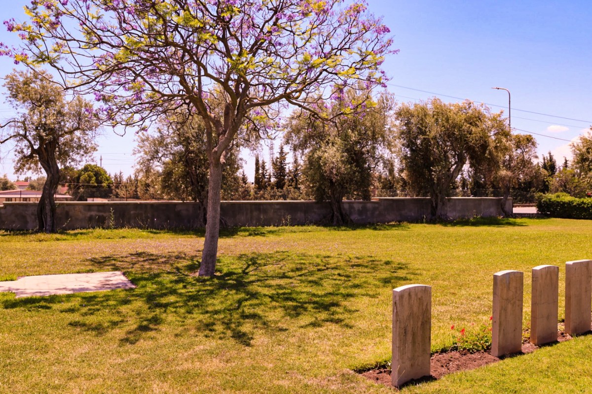 Die herabgefallenen zarten lila Blüten des Palisanderholzbaums sprenkeln den Rasen des Syracuse War Cemetery. 1059 Soldaten des Commonwealth liegen hier. Sie fielen vor 81 Jahren bei der Befreiung Siziliens.