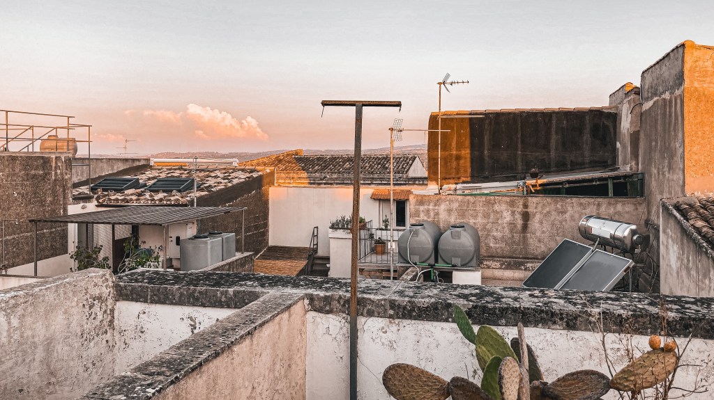 6 Uhr. Die Sonne ist gerade aufgegangen. Noch schieben sich ein paar Wolken, die von der Nacht übrig geblieben sind, vor sie. Aber nicht lange, sie lösen sich schnell auf. Ich sitze auf der Dachterrasse. Auch in der Nachbarschaft gehen die Jalousien hoch. In Sizilien steht man früh auf und bleibt lange wach. Es wird heiß heute. Deshalb noch mal in aller Ruhe durchatmen und Kaffee trinken.