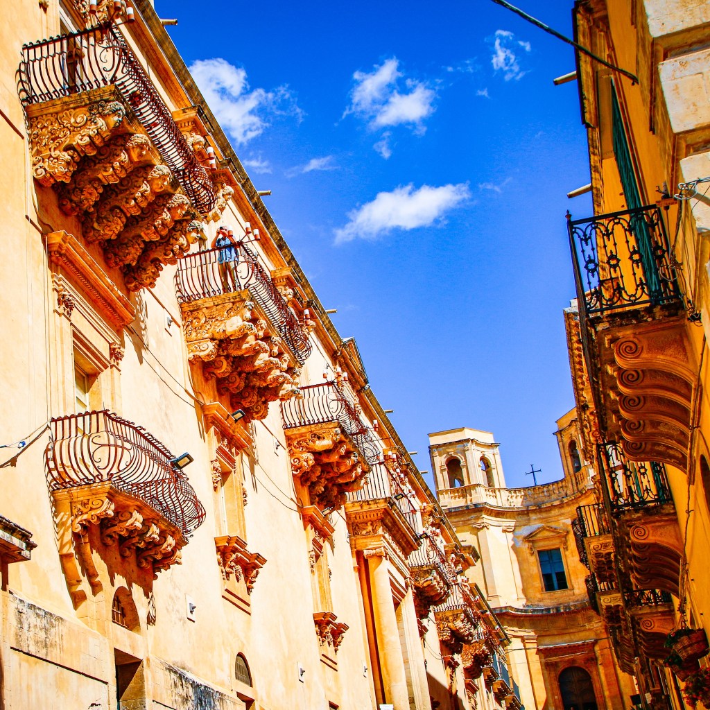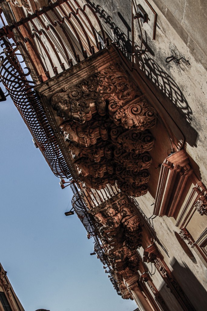 Der Palazzo Nicolacì in Noto ist vielleicht das berühmteste Beispiel für opulente Balkone ohne Zweck. Wer unter ihnen stehen bleibt und den Blick nach oben wendet, dem wird schier schwindlig. Masken, Putten, Löwen, ein ganzes Panoptikum wunderlicher Figuren hält die Balkone fest. Wer ein bisschen länger verweilt, traut seinen Sinnen nicht. Dann wirkt diese Heerschar aus Stein nämlich plötzlich lebendig. Das Spiel von Licht und Schatten vermehrt die wundersamen Gestalten, die plötzlich auf den Palazzo-Mauern tanzen.